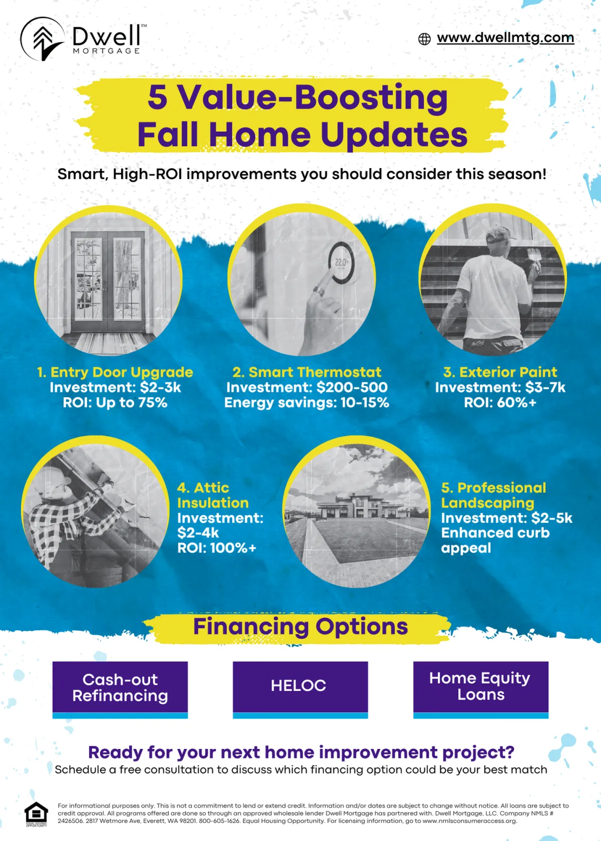 Dwell Mortgage, LLC. Company NMLS # 2426506. Headquarters: 2817 Wetmore Ave, Everett, WA 98201. 800-605-1626.